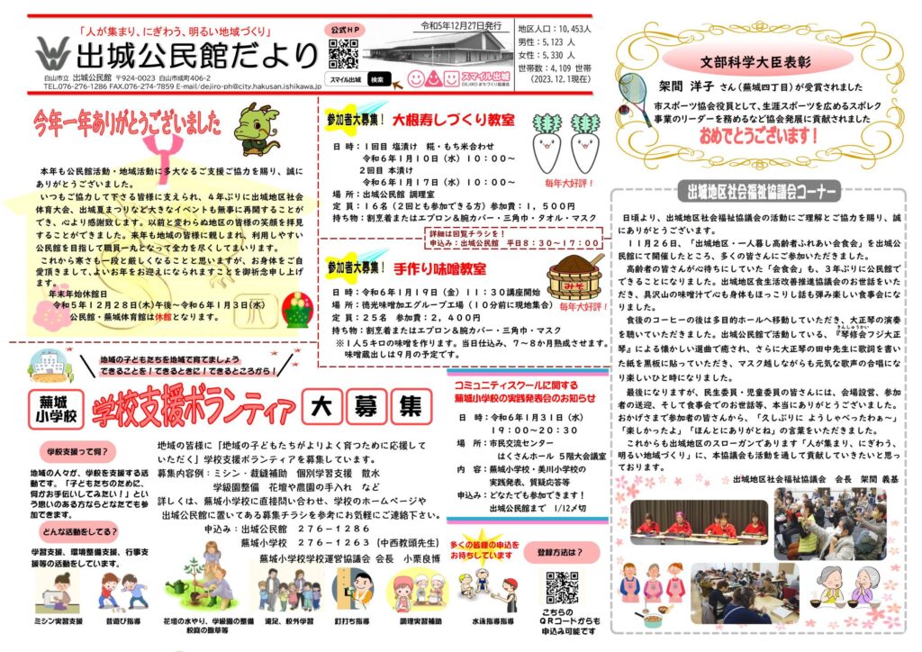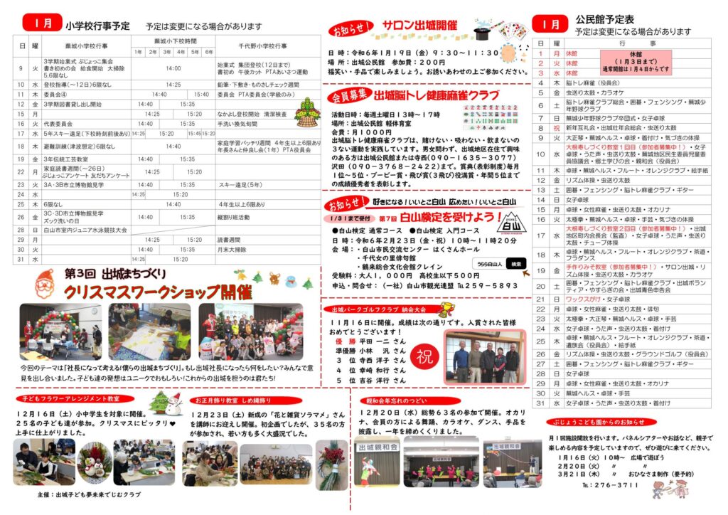 ホームスマイル出城 公民館だより令和5年12月号 2023年12月28日2024年1月25日 公民館だより令和5年12月号です。印刷用のデータ(pdf)は以下からダウンロードできます。 出城公民館だよりR5.12月ダウンロード